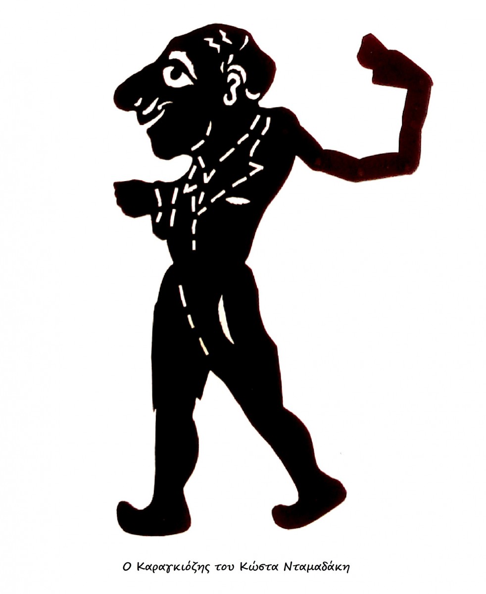 Ο Καραγκιόζης του Κώστα Νταμαδάκη έχει λίγα μαλλιά, μουστάκι και είναι ξυπόλητος. Φοράει σακάκι και κοντό παντελόνι. Τα σκαλίσματα του αποκαλύπτουν τα μαλλιά, το αυτί, το μάτι, το φρύδι, το μουστάκι, τα πέτα του σακακιού, τις τσέπες και τις ζάρες στα ρούχα.