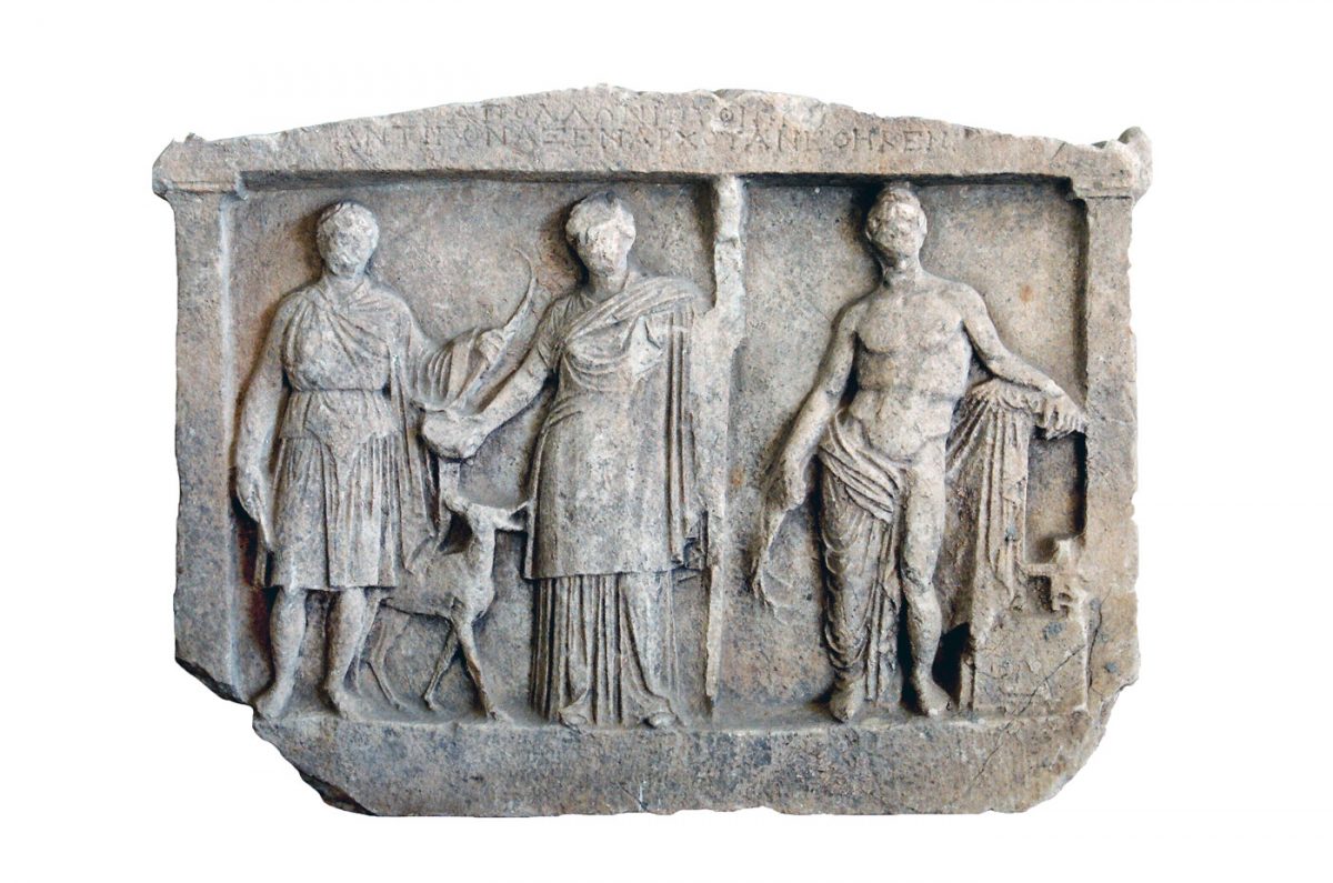 Αναθηματικό ανάγλυφο με παράσταση της απολλώνιας τριάδας. Διαχρονικό Μουσείο Λάρισας, αρ. ευρ. Γ1.