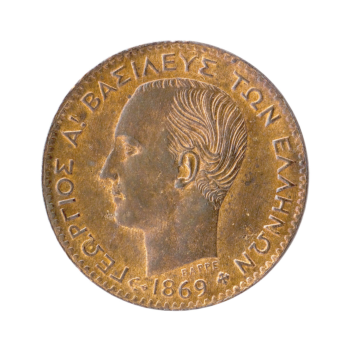 Xάλκινο νόμισμα του Γεωργίου Α΄, 1869. © Τράπεζα της Ελλάδος, Νομισματική Συλλογή, αρ. ευρ. BG-ThB389.