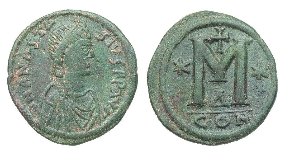 Φόλλις του Αναστασίου Α΄, 491-518, Αθήνα, Νομισματικό Μουσείο (αρ. ευρ. ΝΜ 1892/3 Λ΄ 404). Η θεμελιώδης νομισματική του μεταρρύθμιση, το 498, ορίζει και τη συμβατική απαρχή της βυζαντινής νομισματικής.