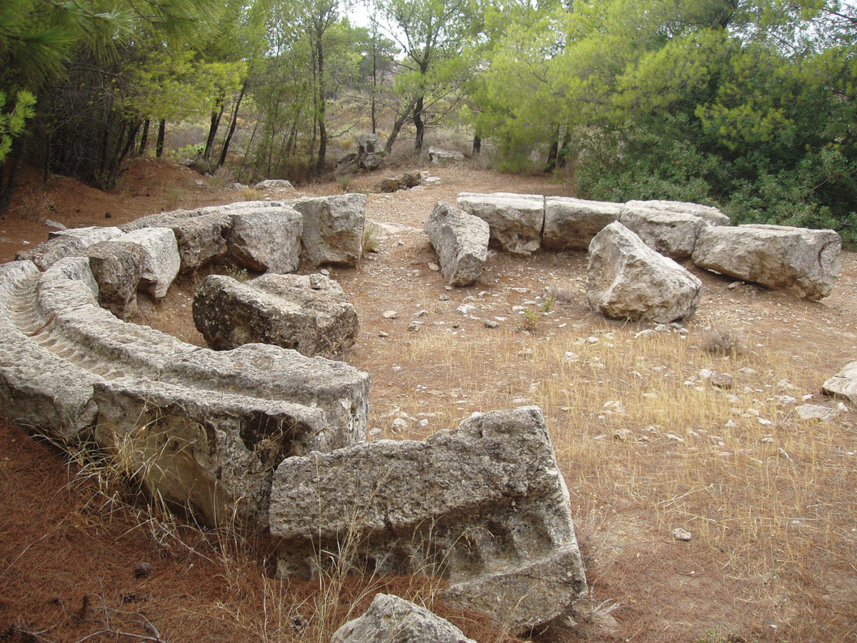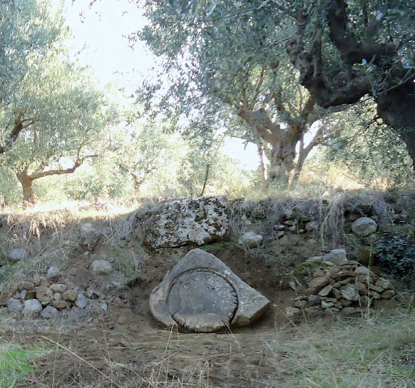 Κυκλική κατασκευή αρχαίου τριβείου στο Δημολιάκι. Ισχυρά διαταραγμένη, έχει συναρμολογηθεί από τεμάχια μαρμάρου. Το αυλάκι στην άνω επιφάνεια φέρει συνεχόμενες κοιλότητες και οι αρμοί του δεν έχουν στεγανοποιηθεί. Φωτογραφία του συγγραφέα.