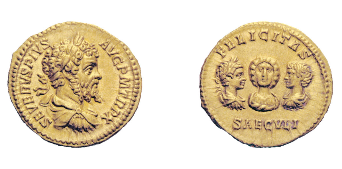 Σεπτίμιος Σεβήρος (193–211 μ.Χ.). Aureus, έκδοση 202 μ.Χ. Απεικονίζεται όλη η αυτοκρατορική οικογένεια. Στον εμπροσθότυπο ο αυτοκράτορας και στον οπισθότυπο η σύζυγός του Ιουλία Δόμνα και τα δύο του τέκνα, Γέτας και Καρακάλλας. Βάρος: 7,26 γρ. Η καθαρότητα του μετάλλου και το βάρος των χρυσών νομισμάτων δεν είχε αλλάξει από την εποχή του Νέρωνα. NAC 92, 23–24 May 2016, 608.