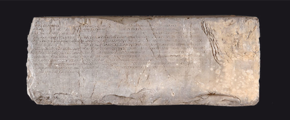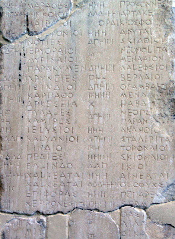 Τμήμα μαρμάρινης στήλης από την Ακρόπολη. Παρατίθενται κατάλογοι με τις ετήσιες εισφορές σε άργυρο (φόρος της εξηκοστής) των μελών της Α΄ Αθηναϊκής Συμμαχίας προς τη θεά Αθηνά (439/8–432/1 π.Χ.). Αθήνα, Επιγραφικό Μουσείο, αρ. ευρ. EM 6857+6648.