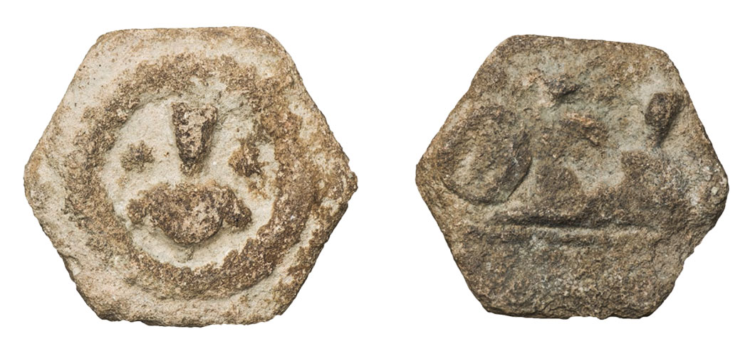 «Σύμβολο» εξαγωνικού σχήματος. 26 χιλιοστά. Όψη α: Προτομή ιερέα κατά μέτωπο. Όψη β: Δύο ανθρώπινες μορφές. Πιθανώς σκηνή συμποσίου. Στα αριστερά διακρίνεται αποτύπωμα ιδιωτικής σφραγίδας. Στο έξεργο επιγραφή. Αρ. ΝΜ 214/2005. Επιγραφικό και Νομισματικό Μουσείο, Αθήνα.
