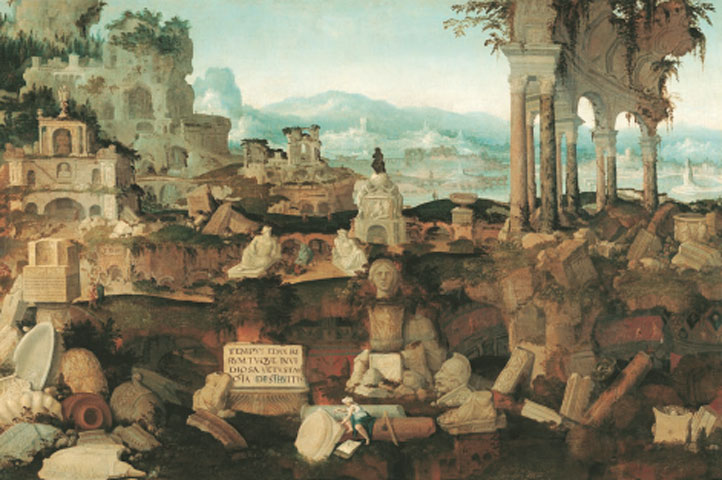 Τοπίο με αρχαιότητες του Ολλανδού ζωγράφου Herman Posthumus (γεν. 1512/13). Στην επιγραφή παράθεμα από τον Οβίδιο (Μεταμορφώσεις 15, 234–5): «Χρόνε που καταβροχθίζεις τα πράγματα και συ μισητή αρχαιότητα, όλα τα καταστρέφετε».