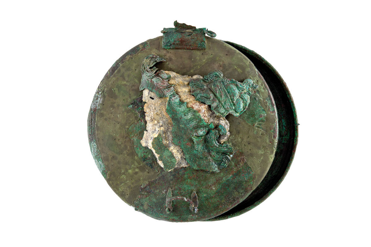 Χάλκινο πτυκτό (αναδιπλούμενο) κάτοπτρο από το αρχαίο Χάλειον (το σημερινό Γαλαξίδι), 4ος αι. π.Χ. (Μ.Μ. 345).