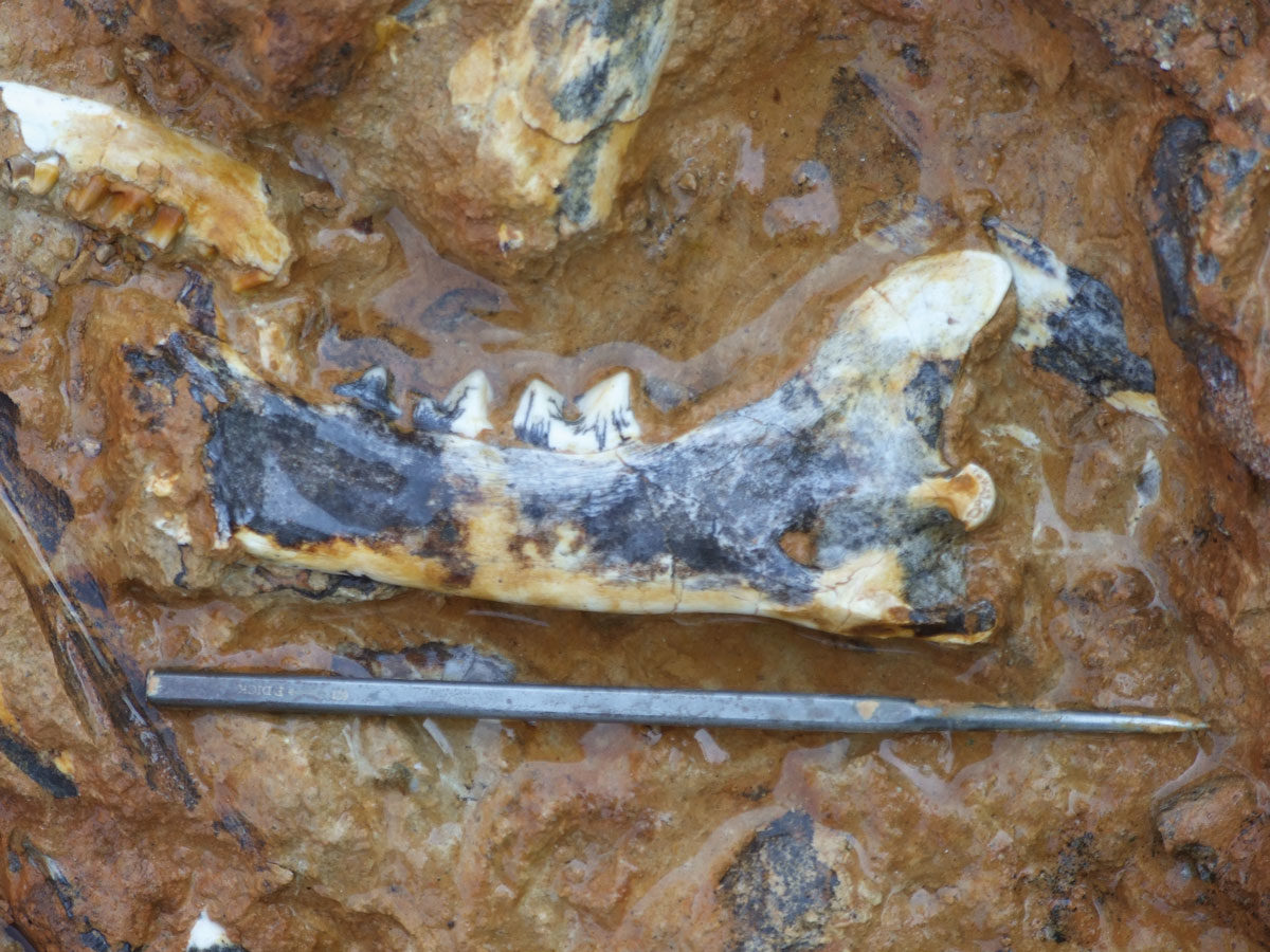 Γνάθος ενός Metailurus parvulus. Απομακρύνθηκε μέσα από το ίζημα της κοίτης όπως και άλλα οστά μετά από προσωρινή εκτροπή του νερού του ρέματος Βαλανάρη. Αφού συντηρήθηκε, εκτίθεται στο Παλαιοντολογικό Μουσείο Πικερμίου. Aνασκαφή 2010 στη θέση PV1. © Γ. Θεοδώρου.