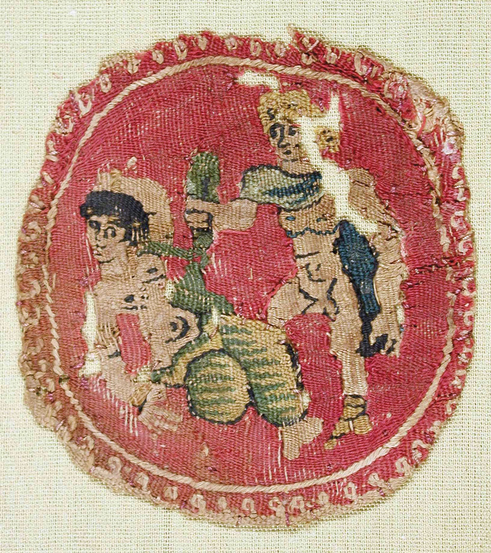 Ανισομερές σημείο με παράσταση Διονύσου που σηκώνει τον πέπλο της Αριάδνης, λινάρι και μαλλί (Μουσείο Μπενάκη, αρ. ευρ. 7131_2).