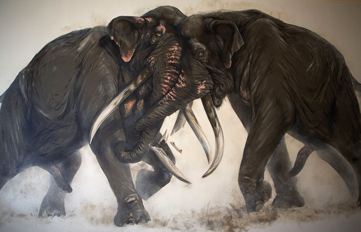 Η μάχη δύο αρσενικών ελεφάντων σε περίοδο αναπαραγωγής είχε ως αποτέλεσμα να σπάσει ο δεξιός χαυλιόδοντας του ενός. Ζωγραφική αναπαράσταση: R. Bakker, επίβλεψη: D. Mol. Τοιχογραφία στο Τραμπάντζειο Γυμνάσιο, Σιάτιστα.