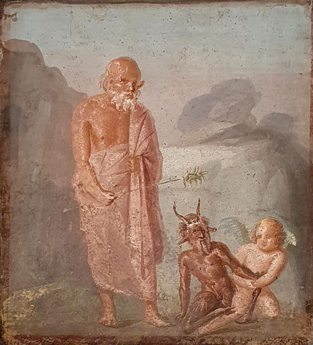 Πομπηία. Οικία Μελέαγρου. Πάνας και Έρως με την εποπτεία Παποσειληνού, ντυμένου αρχαιοπρεπώς (1ος αι. μ.Χ.).