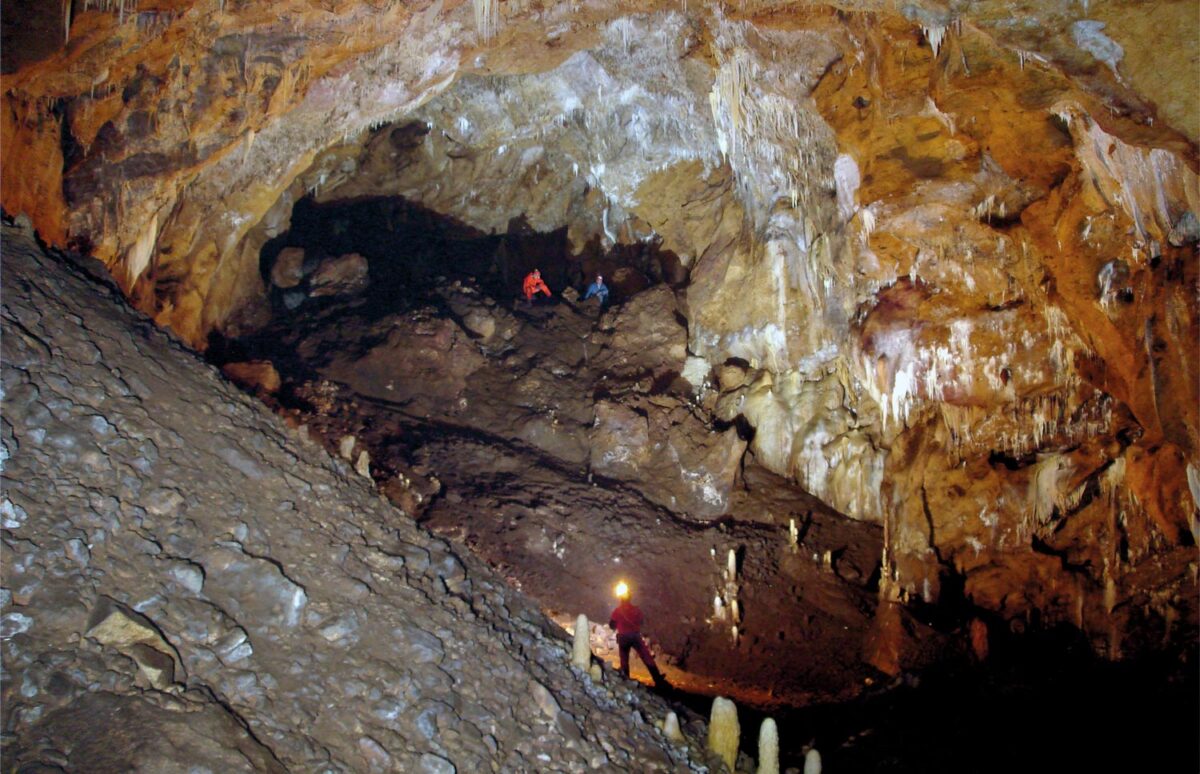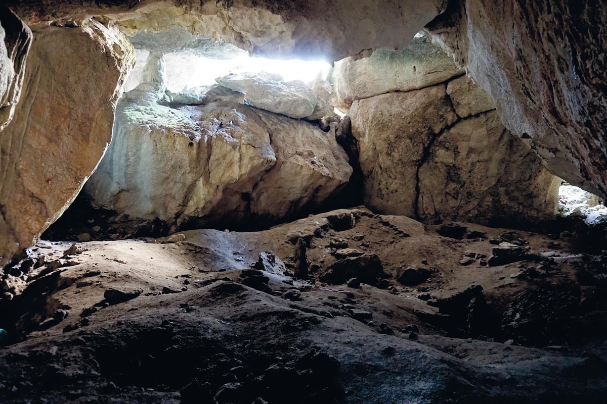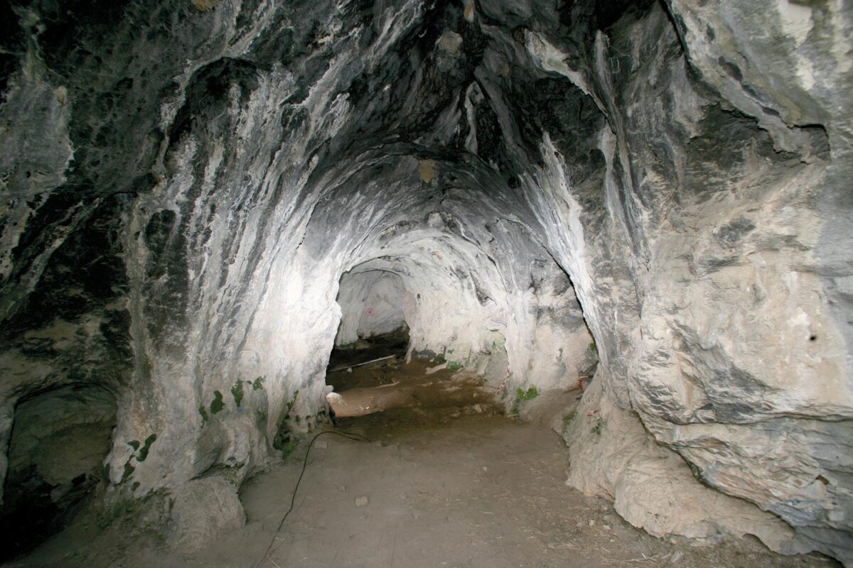 Άποψη του εσωτερικού του σπηλαίου με ανθρώπινα οστά κάτω από σταλαγμιτική κρούστα και αγγεία στο βάθος.