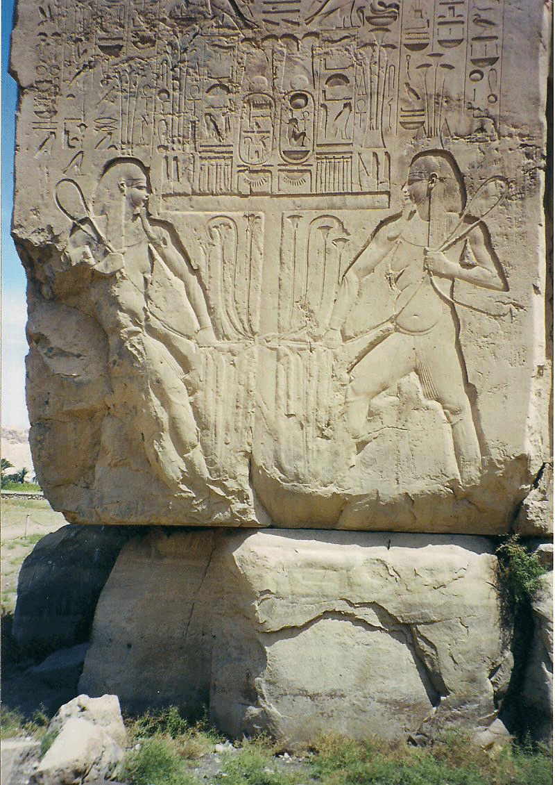 Διπλή απεικόνιση του Χάπι, αρχαίου αιγυπτιακού θεού του Νείλου. Η εικόνα δείχνει κάθε φιγούρα του Χάπι να δένει τα σύμβολα της Κάτω και της Άνω Αιγύπτου, παπύρους και λωτούς αντίστοιχα. Λεπτομέρεια από τον αριστερό Κολοσσό του Μέμνονα, στο Κομ ελ Χετάν της Αιγύπτου. Εποχή Αμενχοτέπ Γ΄(1391 – 1353 π.Χ.).