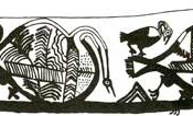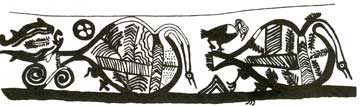 Τα πουλιά, όταν είναι ζωντανά και πατούν στο έδαφος, στέκονται πάνω στα πόδια τους. Μονάχα όταν είναι νεκρά απλώνουν τα πόδια τους προς τα πίσω (εικ. 1). Στις εικόνες, βλέπουμε τα νεκρά πουλιά με τα πόδια τους να φεύγουν προς τα πίσω, χωρίς να πιάνουν στο έδαφος. Τo κεφάλι τους είναι γυρισμένο ανάποδα, όπως δείχνει το ράμφος. Στην εικόνα 2 τα νεκρά πουλιά κατασπαράσσονται α) από δυο ψάρια και β) από ένα όρνεο. Κάτω από τα ψάρια μια διπλή σπείρα συμβολίζει το κύμα, ενώ κάτω από το όρνεο, μια τριγωνική κατασκευή συμβολίζει τη γη (βουνό). Αυτές οι δύο μορφές συμβολίζουν, ίσως, τις δύο μορφές του θανάτου, στη θάλασσα και στη στεριά. Τα δύο είδη ζώων (ψάρια, όρνεα) «καθαρίζουν» τη φύση από τα νεκρά ζώα, ενώ οι άνθρωποι φροντίζουν οι ίδιοι τους νεκρούς τους.