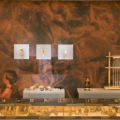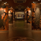 Το ενδιαφέρον του επισκέπτη αποσπά κυρίως η κινηματογραφική περιήγηση, κατά την οποία μπορεί να παρακολουθήσει σε ταινία με αρχή, μέση και τέλος να πρωταγωνιστούν ηθοποιοί και εκθέματα. Όταν τελειώνει η προβολή, με την αναχώρηση του Λέοντα στον πόλεμο, σε ένα σκοτεινό σημείο αριστερά, οι επισκέπτες μαθαίνουν κάθε λεπτομέρεια για το τελετουργικό του θανάτου. Ο πρωταγωνιστής, οι συγγενείς, οι καθιερωμένες τιμές. Στεφάνια μυρτιάς, ρόδια, σέλινο και μυροδόχα αγγεία υπάρχουν ως προσφορές στο νεκρό, ενώ τρισδιάστατα προβάλλεται η στήλη, ο τάφος όπως θα τα έβρισκε ένας αρχαιολόγος. Άλλωστε Η έκθεση «Σκηνές από την καθημερινή ζωή στην αρχαιότητα» είναι αφιερωμένη στους αρχαιολόγους.