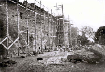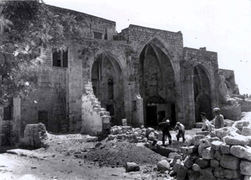 Κατά την πρώτη χρονική περίοδο της ιταλικής κατοχής της Δωδεκανήσου (1912-1923), η οποία χαρακτηρίσθηκε από την αβεβαιότητα της παραμονής των ιταλικών στρατευμάτων στην περιοχή σε συνδυασμό με το ασταθές διεθνές πολιτικό κλίμα, τίθενται οι βάσεις των όσων θα «οικοδομηθούν» εκεί μέσα στις δύο επόμενες δεκαετίες (εικ. 1-2). Προς αυτήν την κατεύθυνση, σημαντικότατη ήταν η συμβολή του έργου της Αρχαιολογικής Αποστολής, με διευθυντή της τον Amedeo Maiuri. Ο Maiuri ως επιστημονική προσωπικότητα, αφού οργάνωσε και συστηματοποίησε την αρχαιολογική έρευνα στη Ρόδο, επιβεβαιώνοντας με αυτόν τον τρόπο την πολιτική της διείσδυσης της Ιταλίας στη Δωδεκάνησο, συντόνισε τις πρώτες επεμβάσεις ανάδειξης της ιπποτικής αρχιτεκτονικής με την αποκατάσταση συγκεκριμένων μνημείων της μεσαιωνικής πόλης. Η ανάδειξη των καταλοίπων της ιπποτοκρατίας, πολύ σύντομα άρχισε να χρησιμοποιείται με σκοπό την ενδυνάμωση των ιταλικών βλέψεων στην περιοχή. Κατά τη διετία 1914-16, αποκαθίστανται το πρώην Νοσοκομείο των Ιπποτών όπου στεγάζεται το Αρχαιολογικό Μουσείο της πόλης και στο πλαίσιο των επεμβάσεων επί της Οδού των Ιπποτών, το κατάλυμα της «γλώσσας» της Ιταλίας με την εγκατάσταση εκεί του Μορφωτικού Ιδρύματος Dante Alighieri (εικ. 1-2). Επίσης, κατά το ίδιο χρονικό διάστημα αλλά και τα χρόνια που ακολουθούν τον Α΄ Παγκόσμιο Πόλεμο οι επεμβάσεις αποκατάστασης σε πύλες και τμήματα της οχύρωσης της πόλης, σε συνδυασμό με το διάταγμα της ανακήρυξης σε μνημειακή ζώνη του περιβάλλοντα χώρου αυτής, στοιχειοθετούν τη γενικότερη τακτική επισφράγισης της ιταλικής παρουσίας στα Νησιά, μέσω της προβολής και ανάδειξης των αρχιτεκτονικών καταλοίπων του τάγματος των Ιωαννιτών Ιπποτών ως έργα της ιταλικής παράδοσης (εικ. 3).