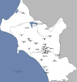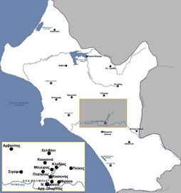 α) χερσαία «περάσματα», από τη βόρεια προς τη νότια Πελοπόννησο (Επιτάλιο, Σαμικό, Κακόβατος, Λέπρεο).