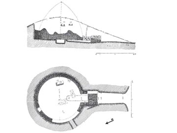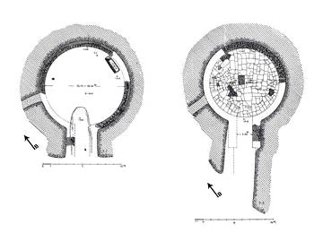 β) Χτίζονται εντυπωσιακοί, ως προς το μέγεθος (Κακόβατος) ή και μικρότεροι (Σαμικό) θολωτοί τάφοι (εικ. 4). Ο αρχιτεκτονικός τύπος απαντά με αυξημένη συχνότητα στη Μεσσηνία, όπου σπανίζουν οι θαλαμωτοί, ενώ το ίδιο επισημαίνεται και στην Τριφυλία.