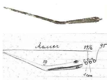 δ) Η ένταξη της βόρειας Τριφυλίας στη μεσσηνιακή πολιτισμική και πολιτική ενότητα μαρτυρείται όχι μόνο από την κατασκευή τύμβων και θολωτών τάφων, αλλά και από την εκτέλεση παρόμοιων ταφικών πρακτικών, όπως για παράδειγμα η παρουσία κεκαμμένου ξίφους στον τάφο Β του Κακοβάτου (εικ. 11), την προσφορά παραπλήσιων κτερισμάτων μικροτεχνίας και μεταλλοτεχνίας (χρυσό περίαπτο γλαυκός, ήλεκτρο, ψήφοι αμέθυστου, ξίφος τύπου Α – εικ. 12-13), την απόθεση αγγείων, όμοιων είτε ως προς το σχήμα είτε ως προς το διάκοσμο. Αναφέρονται ενδεικτικά η αμφίπροχος κύλικα, αμφορείς με ελλειπτικό στόμιο, πιθοειδή, κάνθαρος, ανακτορικοί πιθαμφορείς.