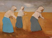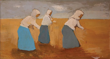 Αντίθετα, στο ημιτελές έργο του, Γυναίκες που θερίζουν σιτάρι (εικ. 2), ο Γλιάτας αποκαλύπτει τις επιρροές του από το χώρο της δυτικής ζωγραφικής. Πρόκειται για ένα θέμα που έχει προσεγγίσει για πρώτη φορά ο σημαντικός ρεαλιστής ζωγράφος Ζαν-Φρανσουά Μιλέ (Jean-François Millet, 1814-1875) στα μέσα του 19ου αιώνα, και εδώ ο ζωγράφος μάς δίνει τη δική του εικαστική πρόταση στη σύνθεση. Στο έργο αυτό, ο Γλιάτας προσπαθεί να μετατρέψει ακόμα και την πιο απλή καθημερινή εργασία σε μια ιερή, ευγενική πράξη. Υπερβαίνει την καθημερινή πραγματικότητα της ζωής των αγροτών, διαποτίζοντας τη σκηνή με μια δυνατή αίσθηση αξιοπρέπειας.