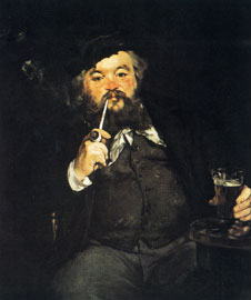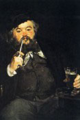 Στο έργο, Το Απολαυστικό Κρασοπότηρο του Μανέ (εικ. 5), ο ζωγράφος μάς αποκαλύπτει ότι εκτός από τον Μιλέ και τον Βαν Γκογκ, δέχεται γόνιμες επιρροές και από τον σπουδαίο Γάλλο δημιουργό Εντουάρ Μανέ. Ο Γλιάτας προσεγγίζει το θέμα του Μανέ (εικ. 6), φιλτράροντάς το μέσα από τη δική του καλλιτεχνική ιδιοσυγκρασία. Η έκφραση του πρωταγωνιστή καθρεφτίζει με πολύ εύγλωττο τρόπο τον πληθωρικό, σίγουρο και δυνατό χαρακτήρα του. Τυπολογικές διαφοροποιήσεις σε σχέση με το πρωτότυπο εστιάζονται στο βλέμμα του άνδρα που ο ζωγράφος μας επιλέγει να μην κοιτάζει το θεατή στη διακόσμηση των παρυφών του γιλέκου και, τέλος, στην απουσία ενός μικρού τραπεζιού, που βρίσκεται κάτω δεξιά, απ’ το οποίο ο πότης έχει σηκώσει το ποτήρι του.