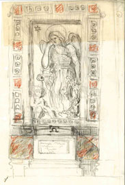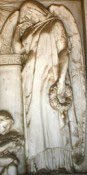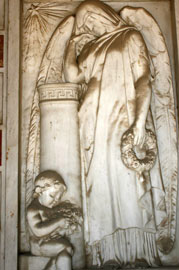 Η επιτοίχια ανάγλυφη πλάκα φέρει παράσταση αγγέλου με αρχαιοπρεπή ενδυμασία, όρθιου, στηριζόμενου σε κίονα με εγχάρακτη διακόσμηση μαιάνδρου. Γέρνει ελαφρά το κεφάλι προς τον δεξή ώμο, και ακουμπά το μάγουλο στο δεξί χέρι, σε στάση περισυλλογής ή θλίψης. Με το αριστερό κρατά στεφάνι από άνθη, το οποίο περιθέει ταινία. Ένα άστρο στην αριστερή γωνία της παράστασης κατευθύνει τις ακτίνες του προς τη μορφή. Στη βάση του κίονα παριστάνεται καθιστό ένα γυμνό νήπιο που κρατά στην αγκαλιά του δέσμη από άνθη. Είναι, όπως αναφέραμε ήδη, έργο του Γάλλου γλύπτη και ακαδημαϊκού Louis Lejeune, πάνω σε σχέδιο του αρχιτέκτονα.
