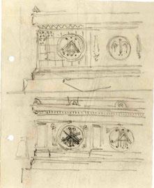 Ενδιαφέρον παρουσιάζουν τα διακοσμητικά μοτίβα του μνημείου και ιδιαίτερα το θέμα της κλεψύδρας εγγεγραμμένης σε στέφανο και πλαισιωμένης από φτερά, τα οποία περιθέει ταινία. Το θέμα της φτερωτής κλεψύδρας, παρότι δεν συνηθίζεται στα ελληνικά κοιμητήρια [σημ. 14] απαντά σε όλα τα ταφικά μνημεία του Κουρεμένου. Εδώ, όμως, τόσο η θέση όσο και οι διαστάσεις προβάλλουν εμφατικά το συμβολισμό του θέματος. Η φτερωτή κλεψύδρα είναι συχνό μοτίβο στα κοιμητήρια της Αγγλίας. Η κλεψύδρα από την αρχαιότητα αποτελεί διακριτικό γνώρισμα του Χρόνου ως θεριστή, του θανάτου. Στην ετρουσκική θρησκεία συνδέεται με τον Σατούρνο-Κρόνο. Τα φτερά συμβολίζουν την υπέρβαση και τα δύο τμήματα της κλεψύδρας απεικονίζουν την κυκλική επανεμφάνιση της ζωής και του θανάτου [σημ. 15]. Ο Κουρεμένος έχει μια ιδιαίτερη έφεση στη συμβολική έκφραση και στην ιεράρχηση των συμβόλων που επιλέγει να αποτυπώσει στα έργα του. Αξίζει, λοιπόν, να σημειωθεί ότι η επιλογή της φτερωτής κλεψύδρας στο μέτωπο του μνημείου, ακριβώς πάνω από την επιγραφή του, παρουσιάζεται εξαρχής, δείχνοντας ότι ήταν μια συνειδητή επιλογή του αρχιτέκτονα, την οποία αποδέχθηκε ο εργοδότης.