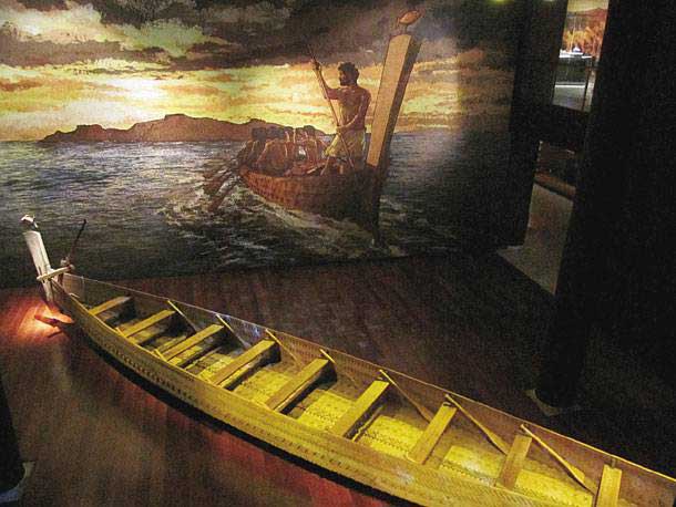 Η πεμπτουσία όμως της έκθεσης βρίσκεται αλλού. Σε ένα τηγανόσχημο αγγείο (2700-2300 π.Χ.) από τη Χαλανδριανή της Σύρου, σύμφωνα με τον κ. Σταμπολίδη. Απεικονίζεται ένα πλοίο με τα αφρίζοντα κύματα του Αιγαίου, τους κωπηλάτες και, αντί σημαίας, ένα ψάρι. Το ακριβές αντίγραφο του πλοίου αποτελεί τη μεγάλη έκπληξη της έκθεσης που έστησε ο πολυβραβευμένος Τσέχος αρχιτέκτονας Μπόρις Μίκα.