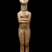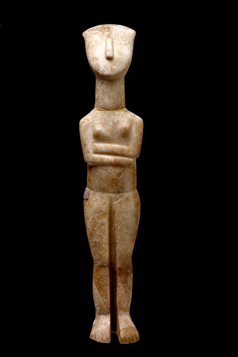 Ραχοκοκαλιά της έκθεσης είναι η ενότητα με τα ειδώλια και η παράλληλη παράθεσή τους. Σε απέναντι βιτρίνες βλέπεις πώς εξελίσσονται από τη μια τα κυκλαδικά ειδώλια, πώς αποκτούν χαρακτηριστικά (άντρας-γυναίκα, έγκυος ή ηλικιωμένη με ρυτίδες) και ιδιότητες (μουσικοί, χορευτές, συμποσιαστές) και πώς παραμένουν ως το τέλος άμορφα (βιολόσχημα ή πτυόσχημα) τα «απέναντι».