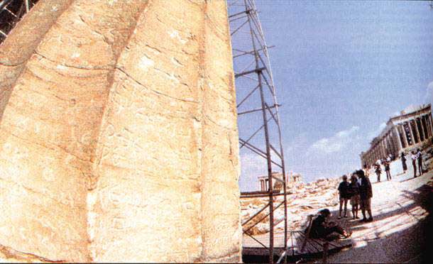 Τα χαράγματα στον Παρθενώνα ξεκινάνε από την κορυφή του ναού και φθάνουν έως τα σκαλοπάτια του. Στους κίονες της δυτικής πλευράς που τώρα αποσυναρμολογείται για να αναστηλωθεί, ακριβώς κάτω από τα κιονόκρανα, διαβάζεις με ωραία καλλιγραφικά γράμματα ονόματα θανόντων αρχιερέων, μοναχών, διακόνων και πλάι τη χρονολογία του θανάτου τους. Κι όλα αυτά σε ύψος 8 μέτρων στην εσωτερική πλευρά των κιόνων, όπου σώζεται ακόμη η ξανθοκάστανη πατίνα (ή το χρυσαφί με το οποίο ήταν βαμμένοι οι κίονες). Για κάποιον λόγο έχουν ακόμη χαράξει κάποια εκκλησιαστικά κείμενα, ψαλμούς, τροπάρια, ευχές, δεήσεις από την εποχή που ο ναός της Αθηνάς λειτουργούσε ως Παναγία Αθηνιώτισσα.