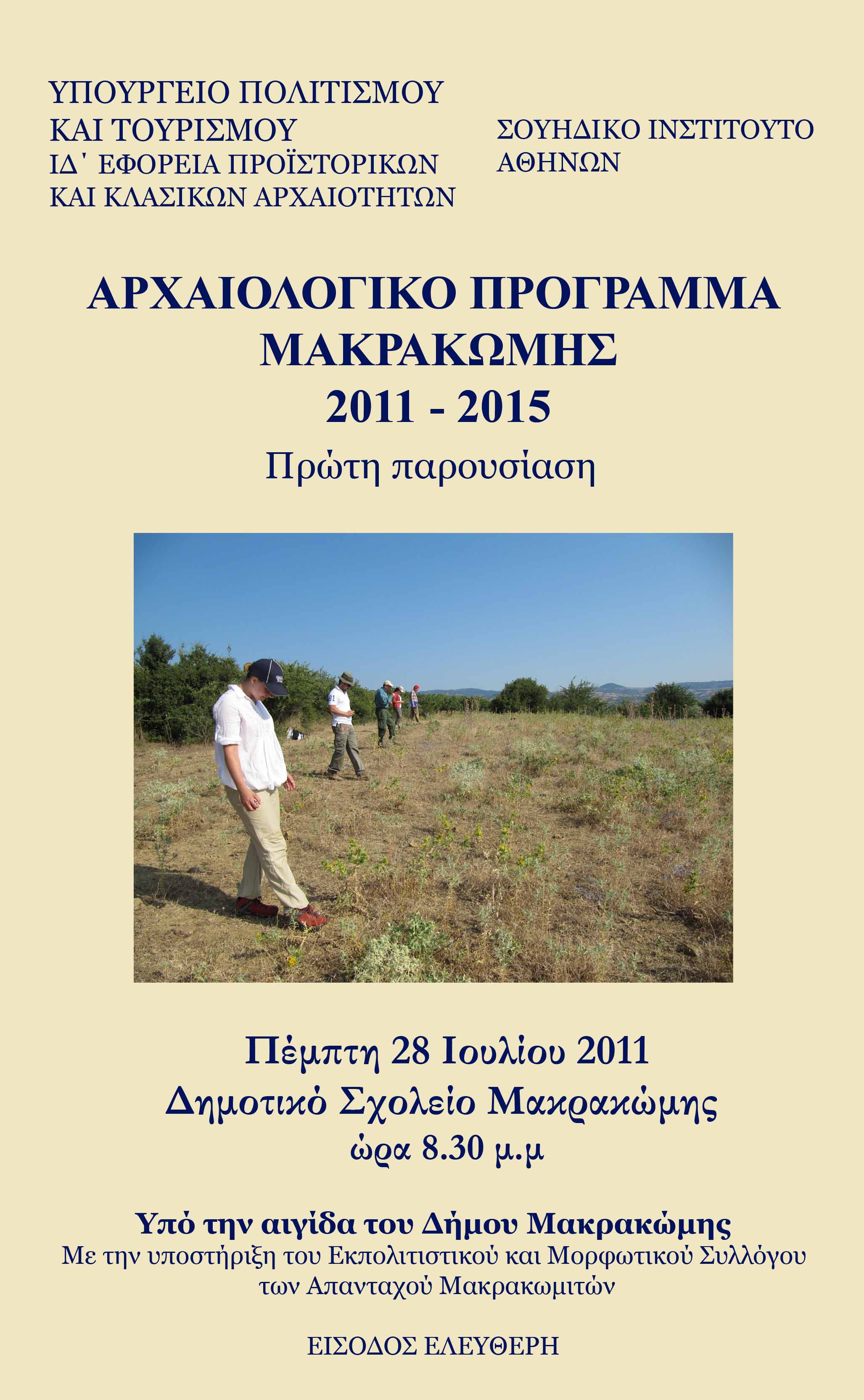 Με επιτυχία πραγματοποιήθηκε την Πέμπτη 28 Ιουλίου η εκδήλωση την οποία διοργάνωσαν η ΙΔ΄ Εφορεία Προϊστορικών και Κλασικών Αρχαιοτήτων και το Σουηδικό Ινστιτούτο Αθηνών υπό την αιγίδα του Δήμου Μακρακώμης και την υποστήριξη του Εκπολιτιστικού και Μορφωτικού Συλλόγου των Απανταχού Μακρακωμιτών για την παρουσίαση του πενταετούς Αρχαιολογικού Προγράμματος Μακρακώμης 2011 – 2015.