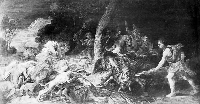 Το σχέδιο που αποδίδεται στον Πέτερ Πάουλ Ρούμπενς (1577-1640) και χρονολογείται το 1618 είναι εμπνευσμένο από τη «Μεταμόρφωση» του Οβιδίου που περιγράφει τον Μελέαγρο να σκοτώνει τον κάπρο που σκότωνε τους γεωργούς στην πόλη Καλυδώνα στην Αιτωλία, σύμφωνα με τον μύθο. Ο μεγάλος ζωγράφος το δημιούργησε μετά την παραμονή του στην Ιταλία. Το προφίλ του κάπρου είναι παρμένο από ένα μαρμάρινο γλυπτό στην γκαλερί Ουφίτσι στη Φλωρεντία, ενώ στοιχεία για τις μορφές των αλόγων είναι δανεισμένα από τους Ντα Βίντσι και Ραφαήλ. Αλλά η δυναμική και η απεικόνιση του κυνηγιού ανήκουν στον Ρούμπενς. Το έργο εδραιώνει την επική σύγκρουση μεταξύ ανθρώπου και ζώου. Το Μουσείο Γκετί άλλωστε αγόρασε και εξέθεσε το 2006 μία ελαιογραφία με το ίδιο θέμα και τίτλο, του 1611 ή του 1612, που τη θεωρούσαν χαμένη. Πάντως το «Κυνήγι του καλυδώνιου κάπρου» αναπαριστά την πρώτη σκηνή κυνηγιού του Ρούμπενς που γνωρίζουμε και έγινε από τα αγαπημένα του θέματα.