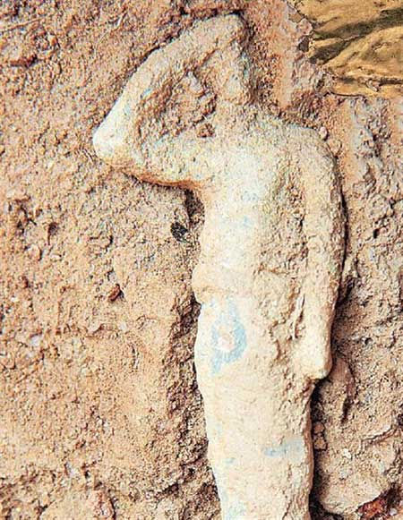 «Το ειδώλιο είναι στην τελετουργική “στάση του αποσκοπείν”, αφού το χέρι επάνω από τα μάτια δηλώνει, κατά τους θρησκειολόγους, ότι θέλει να αποφύγει το θάμβος της θεότητας» λέει η κυρία Σαπουνά-Σακελλαράκη. Παρότι έχει μελετήσει μεγάλο αριθμό ειδωλίων από τις Αρχάνες, τα Κύθηρα, το Ιδαίο Άντρο, δηλώνει εντυπωσιασμένη. «Τέτοια ειδώλια δεν βρίσκονται πλέον εύκολα in situ και αυτό διευκόλυνε τη χρονολόγησή του από το 1600 π.Χ.» επισημαίνει.