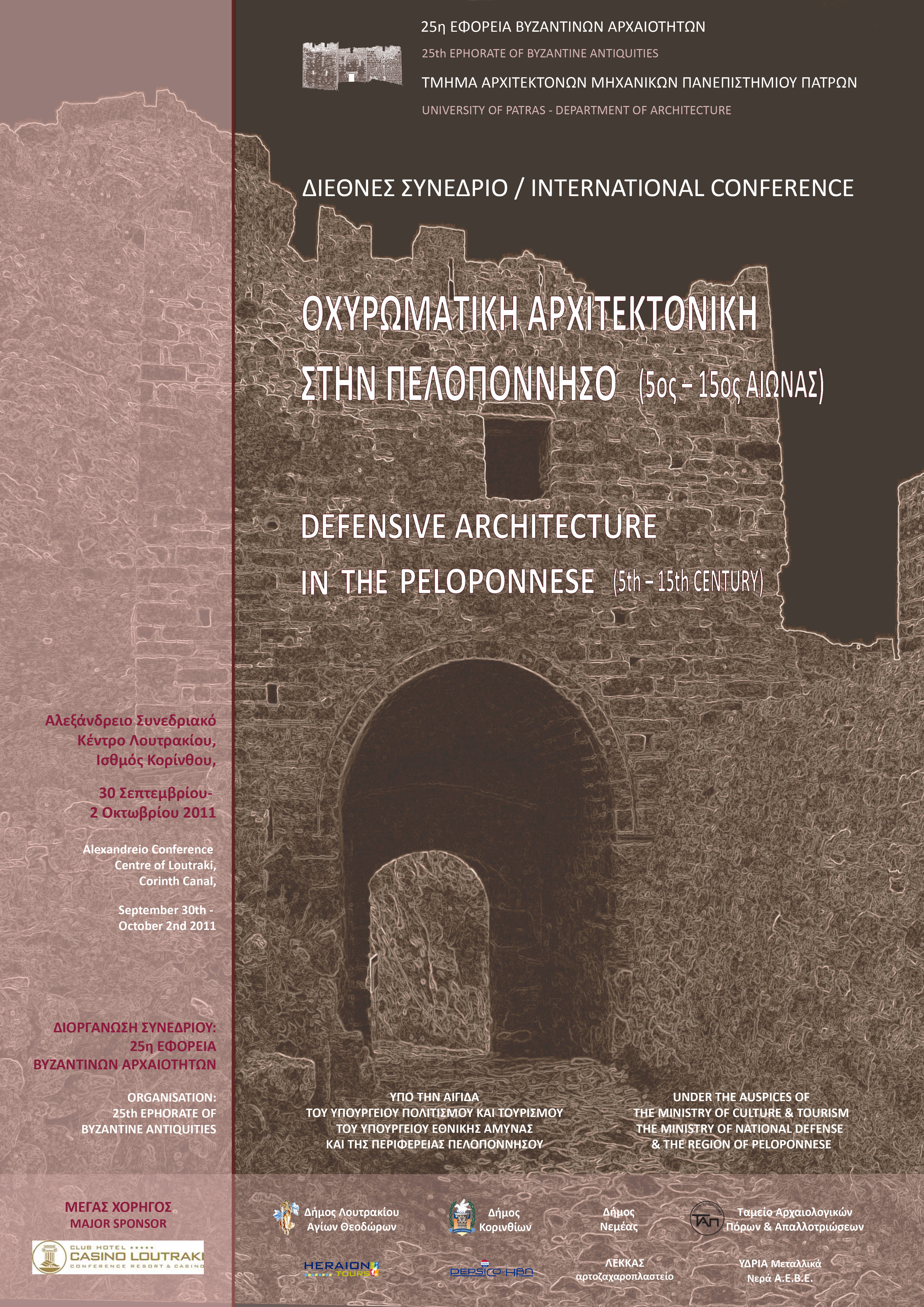 Συνέδριο με θέμα την οχυρωματική αρχιτεκτονική στην Πελοπόννησο διοργανώνεται από την 25η Εφορεία Βυζαντινών Αρχαιοτήτων σε συνεργασία με το Τμήμα Αρχιτεκτόνων Μηχανικών του Πανεπιστημίου Πατρών. Το συνέδριο θα πραγματοποιηθεί από τις 29 Σεπτεμβρίου έως τις 2 Οκτωβρίου 2011 στο Αλεξάνδρειο Συνεδριακό Κέντρο του Δήμου Λουτρακίου. Τελεί υπό την αιγίδα του Υπουργείου Πολιτισμού και Τουρισμού, του Υπουργείου Εθνικής Άμυνας και της Περιφέρειας Πελοποννήσου, ενώ στους χορηγούς περιλαμβάνονται ο Δήμος Λουτρακίου-Αγίων Θεοδώρων, ο Δήμος Κορινθίων, ο Δήμος Νεμέας και το Ταμείο Αρχαιολογικών Πόρων. Μέγας χορηγός είναι το Club Hotel Casino Loutraki.