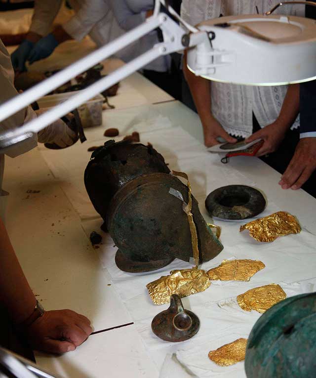 Μεταξύ των αντικειμένων αυτών, ιδιαίτερη αίσθηση προκαλούν τα χρυσά ελάσματα, πιθανόν από τάφο, που κοσμούσαν αρχαίες περικεφαλαίες και όπλα, καθώς και οι χρυσές πατούσες, που τοποθετούνταν τιμητικά στον νεκρό για το αθάνατο βάδισμά του στον Άδη. Την εκτιμητική επιτροπή θα συγκροτήσουν η Πολυξένη Βελένη, προϊσταμένη στο Αρχαιολογικό Μουσείο Θεσσαλονίκης, που ορίστηκε πρόεδρος της Επιτροπής, η Λίλλιαν Αχειλαρά, προϊσταμένη στην ΙΣΤ′ ΕΠΚΑ και η Αγγελική Κοτταρίδου, προϊσταμένη στην ΙΖ′ ΕΠΚΑ.