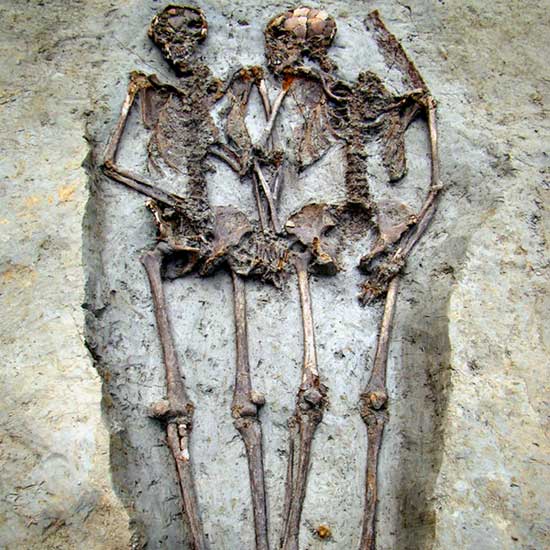 Τα σκελετικά κατάλοιπα ενός ζευγαριού της Ρωμαϊκής περιόδου δείχνουν άνδρα και γυναίκα να κρατιούνται χέρι χέρι. Οι Ιταλοί αρχαιολόγοι ισχυρίζονται ότι ο άνδρας και η γυναίκα τάφηκαν την ίδια χρονική στιγμή, κάπου ανάμεσα στον 5ο και 6ο αι. μ.Χ., στην κεντρική-βόρεια Ιταλία. Η γυναίκα, που φορεί χάλκινο δακτυλίδι, είναι τοποθετημένη έτσι ώστε μοιάζει να κοιτά τον άνδρα σύντροφό της.