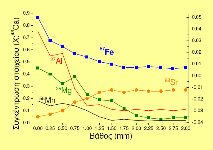 Τα προφίλ χημικών στοιχείων από τα επιφανειακά στρώματα προς το εσωτερικό του μαρμάρου παρέχουν επίσης πολύ σημαντικές πληροφορίες [σημ. 19] για την αυθεντικότητα ενός έργου, δεδομένου ότι η φυσική πατίνα εμφανίζει σταδιακή ελάττωση στα στοιχεία που διεισδύουν από το χώμα στο μάρμαρο (αργίλιο (Al), πυρίτιο (Si), σίδηρος (Fe) κ.λπ.) σε αντίθεση με το στρόντιο (Sr) το οποίο αυξάνεται (εικ. 10). Οι κατεργασίες και οι συνθετικές πάστες γήρανσης διακρίνονται από σταθερές τιμές αυτών των χημικών στοιχείων σε ένα επιφανειακό στρώμα και απότομη πτώση και μηδενισμό τους στο εσωτερικό. Τα προφίλ αυτά μπορούν να γίνουν βέβαια με SEM-EDXRF αλλά και μη καταστρεπτικό τρόπο, χρησιμοποιώντας τεχνολογία λέιζερ (Laser Ablation-Induced Coupled Plasma-Mass Spectrometry, LA-ICP-MS [σημ. 20] και Laser Induced Breakdown Spectroscopy, LIBS [σημ. 21]), η οποία καθιστά τις αναλύσεις αυτές εξεζητημένες αλλά όχι αδύνατες στον ελληνικό χώρο.