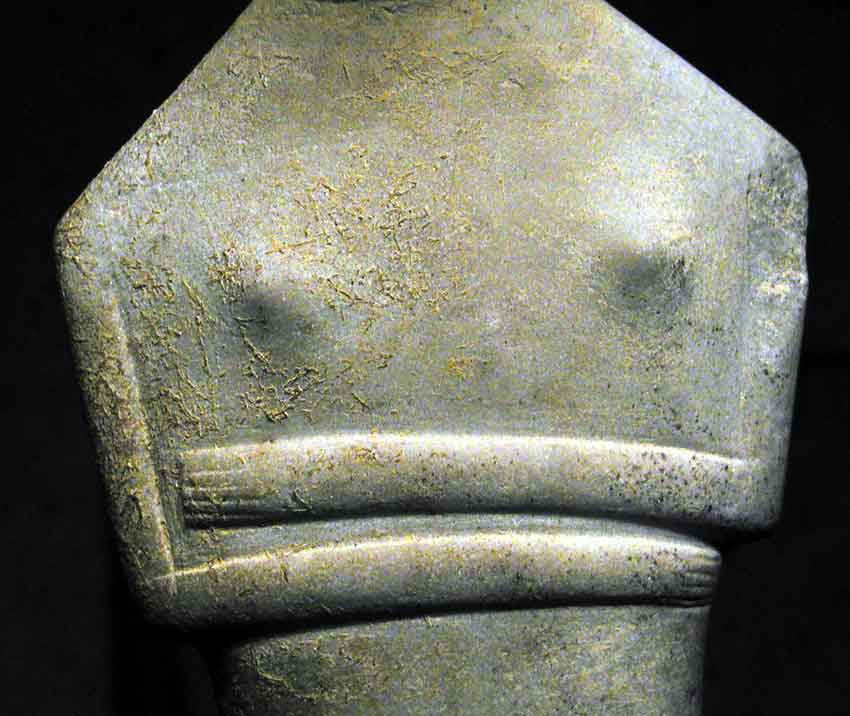 Πολλά κίβδηλα αντικείμενα έχουν αποκαλυφθεί από την παρουσία μη αναμενόμενων ορυκτών ή χημικών στοιχείων στην πατίνα του μαρμάρου. Μια ομάδα κυκλαδικών ειδωλίων στη συλλογή της Καρλσρούης αποδείχτηκε κίβδηλη, επειδή το κύριο συστατικό της πατίνας ήταν η γύψος [σημ. 9]. Η αποκάλυψη της απάτης έγινε το 1967 με ανάλυση δείγματος από τα επιφανειακά στρώματα, ενώ σήμερα θα μπορούσε κανείς πολύ εύκολα να διαπιστώσει με φορητή συσκευή micro-XRF ότι το κύριο χημικό στοιχείο της επιφάνειας είναι το θείο. Η διαπίστωση αυτή οδηγεί με σχετικά μεγάλη βεβαιότητα στο συμπέρασμα ότι το αντικείμενο έχει υποστεί κατεργασία με θειικό οξύ. Άλλη μια ομάδα ειδωλίων από την ίδια συλλογή βρέθηκε την ίδια εποχή να καλύπτεται από τεχνητή πάστα που περιείχε σκόνη μαρμάρου και οξείδιο του ψευδαργύρου μέσα σε κάποιο οργανικό συνδετικό υλικό [σημ. 10]. Και αυτή η διαπίστωση θα μπορούσε να γίνει σήμερα με μη καταστρεπτικό τρόπο.