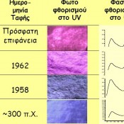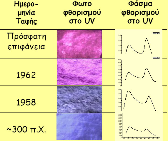 Η πιο συνηθισμένη τεχνική ελέγχου αυθεντικότητας αρχαίων μαρμάρινων αντικειμένων είναι σήμερα η φωτογράφιση του φθορισμού στο υπεριώδες φως. Σύμφωνα με εμπειρικές παρατηρήσεις [σημ. 11] οι νεότερες μαρμάρινες επιφάνειες φθορίζουν στο ιώδες-μωβ χρώμα όταν εκτεθούν σε υπεριώδες φως, ενώ οι αρχαίες εμφανίζουν λευκό-μπλε χρώμα. Η απλότητα του τεστ αυτού και ο φθηνός απαιτούμενος εξοπλισμός κάνουν την τεχνική δημοφιλή στη χρήση για έκδοση πιστοποιητικών αυθεντικότητας κατά τις αγοραπωλησίες αντικειμένων από ιδιωτικά μουσεία. Μέχρι πρόσφατα δεν ήταν κατανοητή η προέλευση των χρωμάτων της ακτινοβολίας φθορισμού. Τα τελευταία χρόνια όμως αποκαλύφθηκε [σημ. 12] ότι το μπλε χρώμα του φθορισμού των αρχαίων επιφανειών οφείλεται στα οργανικά οξέα που προέρχονται από το χώμα, διεισδύουν στα επιφανειακά στρώματα του μαρμάρου και σχηματίζουν σύμπλοκα άλατα του ασβεστίου, τα οποία και φθορίζουν. Δυστυχώς ο φθορισμός αυτός αναπαράγεται εύκολα με παραμονή ενός αντικειμένου για χρονικό διάστημα πάνω από 25 χρόνια σε κατάλληλο περιβάλλον ταφής (εικ. 6). Η τεχνική αυτή συνεπώς δεν είναι αξιόπιστη.
