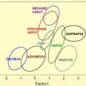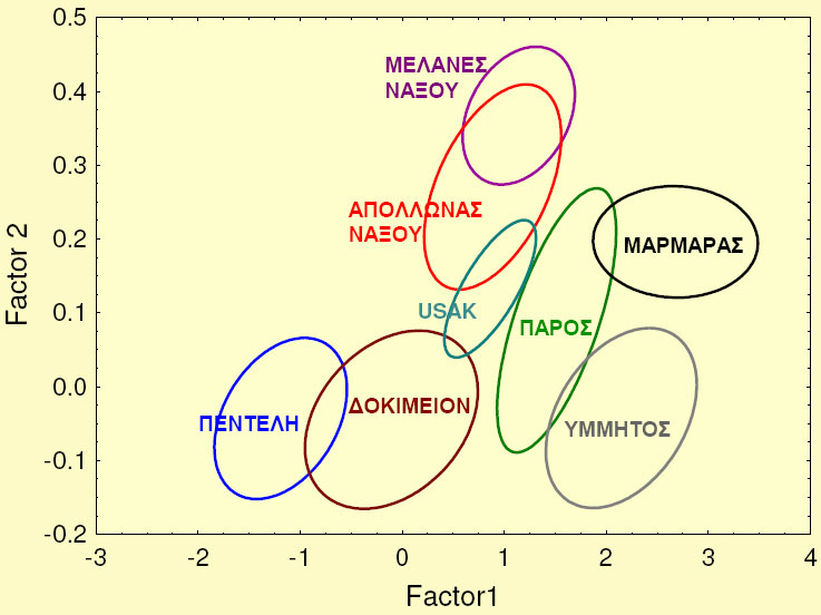 Στις περισσότερες περιπτώσεις, το πρώτο βήμα προς τη διερεύνηση αυθεντικότητας ενός έργου είναι ο προσδιορισμός του λατομείου από το οποίο προέρχεται το μάρμαρο [σημ. 14]. Η μεθοδολογία προσδιορισμού προέλευσης πρώτης ύλης για οποιοδήποτε λίθινο αντικείμενο συνοψίζεται στα ακόλουθα βήματα: α) Χρησιμοποιείται μια αναλυτική τεχνική, αποδεδειγμένα ικανή να διαχωρίζει λατομεία, β) Κατασκευάζεται μια τράπεζα δεδομένων από τις αρχαίες γεωλογικές πηγές του πετρώματος από το οποίο έχει κατασκευαστεί το άγνωστο δείγμα, γ) Ακολουθεί στατιστική επεξεργασία των αποτελεσμάτων, και δ) Το άγνωστο δείγμα αναλύεται με την τεχνική και συγκρίνεται με την τράπεζα δεδομένων. Ένας τυπικός τρόπος παρουσίασης μιας τράπεζας δεδομένων είναι ένα διάγραμμα όπου τα λατομεία παρουσιάζονται με ελλείψεις (εικ. 7). Το δείγμα προβάλλεται στο διάγραμμα και η προέλευσή του προσδιορίζεται ανάλογα με το σημείο του διαγράμματος στο οποίο αυτό εμπίπτει.
