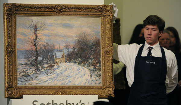Ένας πίνακας του Κλοντ Μονέ με θέμα ένα χιονισμένο τοπίο, ο οποίος ουδέποτε είχε εκτεθεί στο κοινό, πωλήθηκε χθες βράδυ έναντι 9,8 εκατ. ευρώ σε δημοπρασία αριστουργημάτων ιμπρεσιονιστών και μοντέρνων καλλιτεχνών, που διοργάνωσε ο οίκος Sotheby΄s στο Λονδίνο, ανακοινώθηκε από τους διοργανωτές. «Η είσοδος του Ζιβερνί το χειμώνα», έργο του 1885, ουδέποτε είχε παρουσιασθεί στο κοινό έως τη χθεσινή δημοπρασία του Sotheby΄s. Ο πίνακας είχε παραμείνει έως το 1924 στη διάσημη συλλογή του φαρμακοποιού και μεγάλου παρισινού βιομηχάνου Ανρί Κολόν.