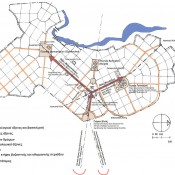 Όλο το σχέδιο χωρίζεται σε δύο ισοβαρείς ενότητες, μέσω ενός νοητού άξονα που ενώνει το πάρκο της Ελιάς με την πλατεία Εμπορίου (Αγορά). Ανάμεσα στις δύο πλατείες παρεμβάλλεται μια μικρή κυκλική πλατεία-κόμβος, μάλλον με μνημειακό χαρακτήρα, που τονίζει περαιτέρω τη μνημειακή αστική μορφή αυτού του άξονα αναψυχής και εμπορίου. Η κυκλική πλατεία έχει επίσης έναν σημαντικό λειτουργικό χαρακτήρα, είναι ο προθάλαμος στην πλατεία Αγοράς και φαίνεται να συντονίζει την προσπέλαση από τις εισόδους της πόλης σε αυτήν, μέσω δύο αξόνων καθέτων στη Λεωφόρο Ανοίξεως που σχηματίζουν γωνία 60° μεταξύ τους. Οι σημερινές θα λέγαμε οδοί Ιπποκράτους και Καρακωστή.