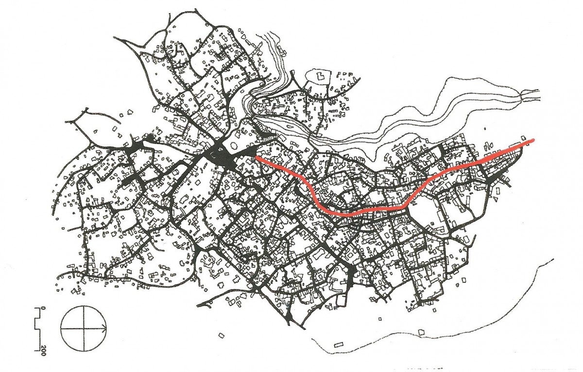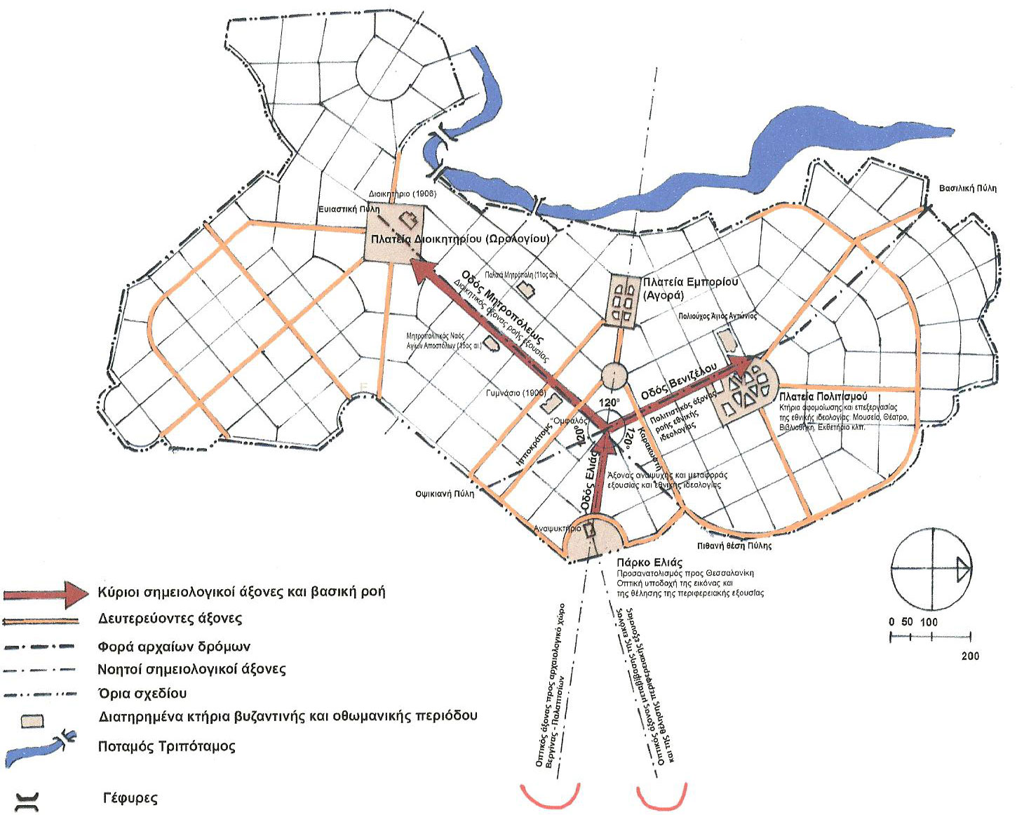 Η οδός Ελιάς διαμορφώνεται ως διχοτόμος των δύο βασικών αρχαίων δρόμων και υποκαθιστά τα τμήματά τους εκείνα, τα οποία επεκτείνονταν προς την Οψικιανή Πύλη, όσον αφορά την οδό Βενιζέλου, που ταυτίζεται περίπου με τη σημερινή Κοντογιωργάκη, και προς μια πιθανολογούμενη Πύλη στη θέση των Αγίων Αναργύρων επί της λεωφόρου Ανοίξεως, όσον αφορά την οδό Μητροπόλεως. Η σχέση των τριών αξόνων εμπλουτίζεται με γεωμετρικές παραμέτρους, δηλαδή σχηματίζουν μεταξύ τους γωνίες 120°. Μάλλον οι ανάγκες της γεωμετρίας είναι η αιτία της μικρής απόκλισης της οδού Μητροπόλεως από τον ιστορικό ρωμαϊκό δρόμο. Η έντονη υποταγή του σχεδίου σε γεωμετρικούς κανόνες και σχήματα οφείλεται στην προτεραιότητα που δόθηκε στην αισθητική, δηλαδή στο φορμαλισμό (διάγρ. Ι).