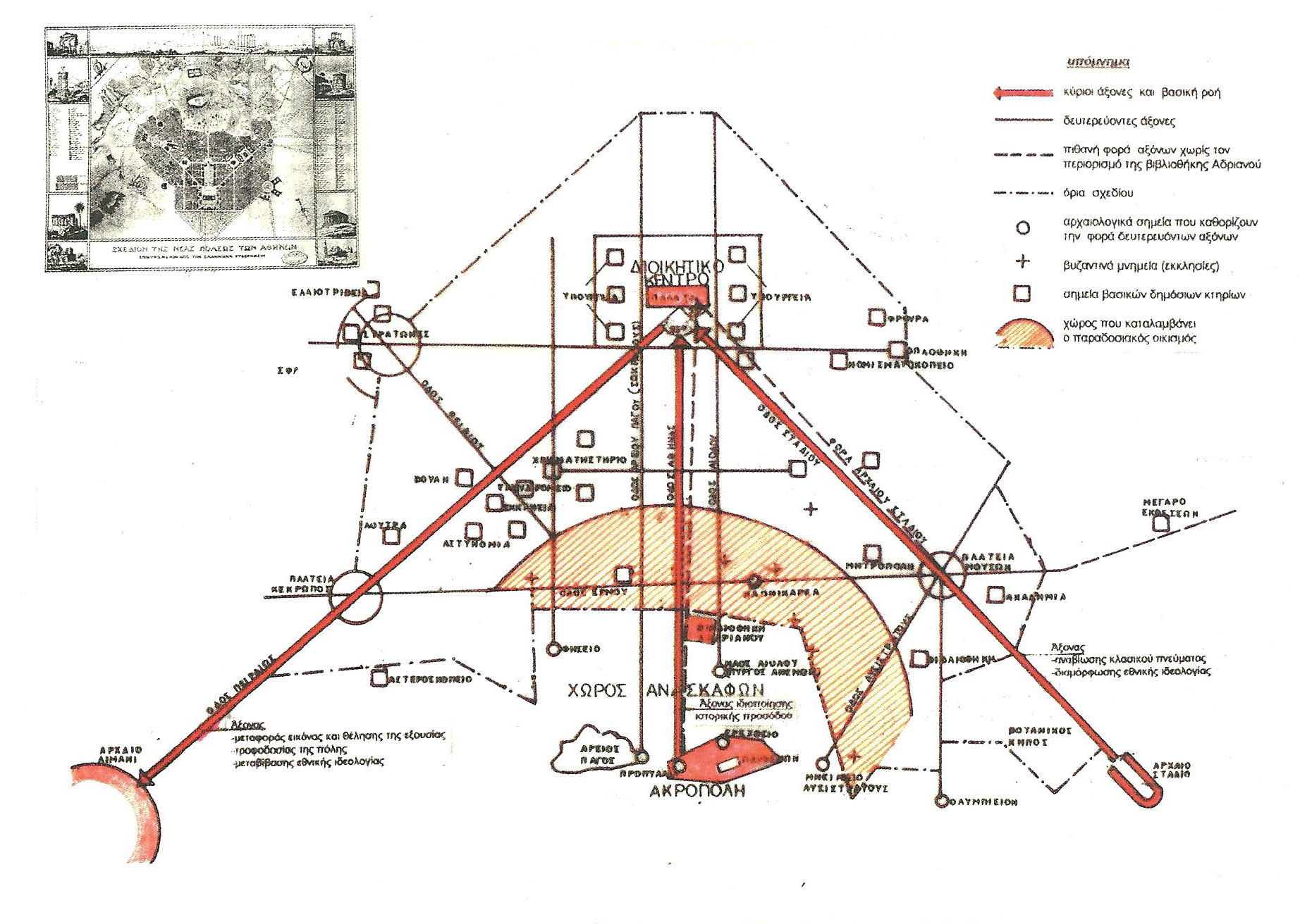 Ως προς το κυκλοφοριακό, αν και συνδεόταν τότε με την αυξανόμενη χρήση των αυτοκινήτων, εντούτοις, στο σχέδιο των Έρτσου-Μακρυδήμα, γίνεται μια ιεράρχηση των δρόμων κυκλοφορίας, όχι τόσο με βάση τη μοντέρνα (δυτικοευρωπαϊκή) θεώρηση, δηλαδή του φόρτου κυκλοφορίας ή της συντόμευσης του χρόνου κυκλοφορίας των εργαζομένων, όσο με βάση τη νοηματική-σημειολογική βαρύτητά τους.