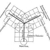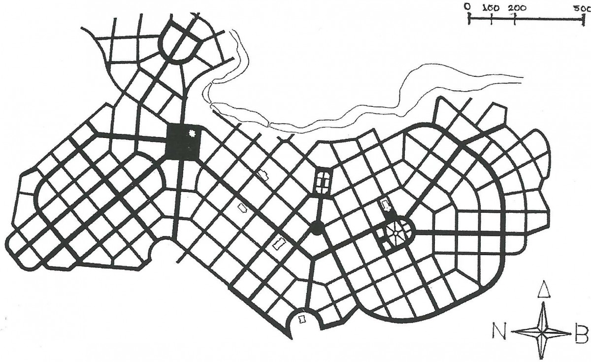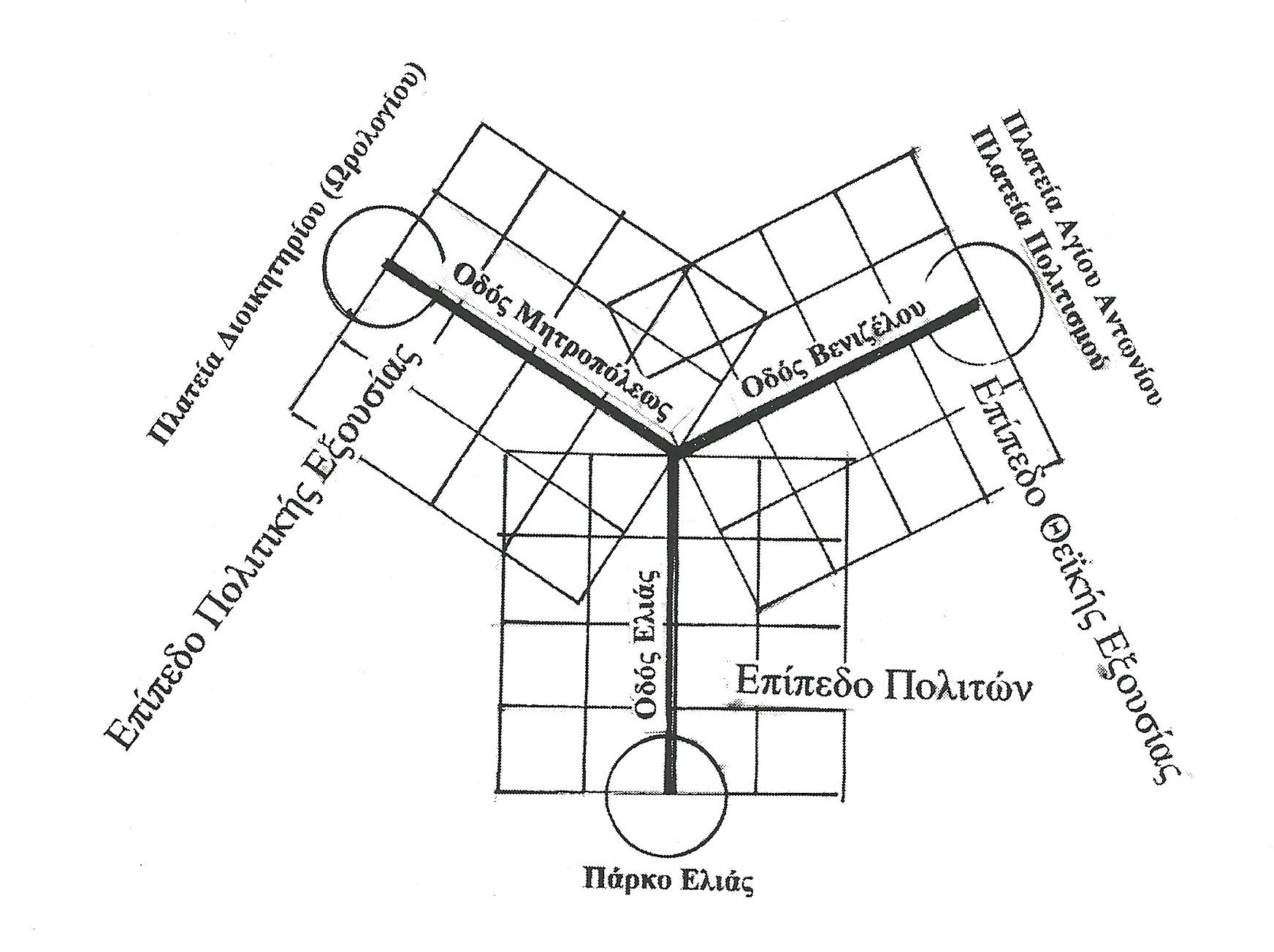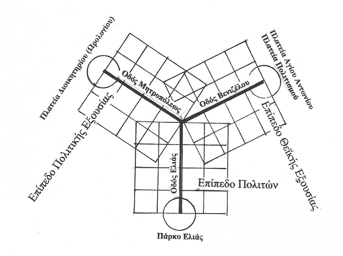 Μπορούμε να πούμε ότι η σχεδιαστική φιλοσοφία εκφράζει μια δημοκρατική ισορροπία ανάμεσα στα τρία επίπεδα, αφού τόσο η ιδεολογικο-θρησκευτική όσο και η πολιτική εξουσία υπολείπονται, ως προς την κεντρικότητά τους, από την κοινωνία των πολιτών που εκφράζεται από τον άξονα πάρκου Ελιάς-πλατείας Εμπορίου (Αγοράς). Αν και η Αγορά δεν τονίζεται σχεδιαστικά, το σχεδιαστικό αυτό έλλειμμα καλύπτεται από την κεντρικότερη θέση που κατέχει στον ιστό της πόλης. Ακόμη και σήμερα αυτές οι απεικονίσεις δίνουν την αίσθηση απουσίας ενός δεσπόζοντος κέντρου και μιας αστοχωρικής ιεραρχίας.