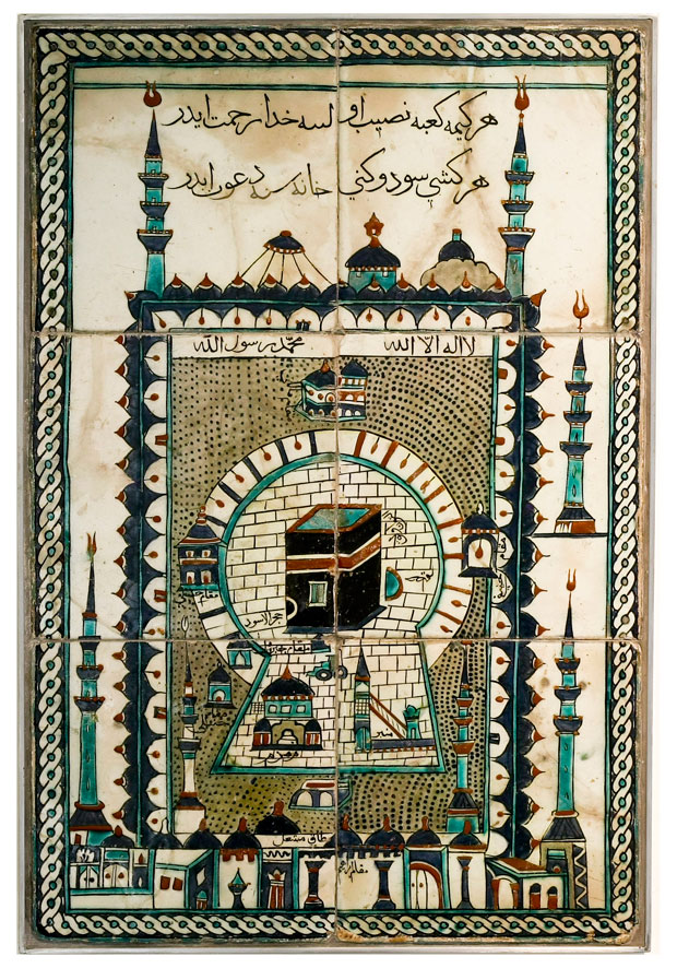 Η συμμετοχή του Μουσείου Μπενάκη συνίσταται σε επτά σημαντικά αντικείμενα της συλλογής, ανάμεσα στα οποία συγκαταλέγεται και ένα ενεπίγραφο σύνολο κεραμικών πλακιδίων Ιζνίκ του 17ου αιώνα. Στη ζωγραφική παράσταση εικονίζεται το ιερό τέμενος της Μέκκας που στο κέντρο της βρίσκεται η Κάαβα, καλυμμένη με το χαρακτηριστικό μαύρο ύφασμα, και άλλα σημαντικά σημεία όπως ο άμβωνας, η πηγή Ζάμζαμ και τα περίπτερα των τεσσάρων νομικών σχολών του Ισλάμ τα οποία και ονοματίζονται.