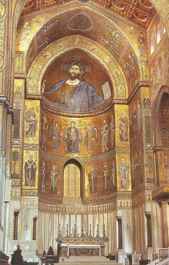 Με το Ισλάμ οι αλληλοεισχωρήσεις ήταν γενικά πιο περιορισμένες εξαιτίας της θρησκείας. Ωστόσο, από τα διακοσμητικά φοινικόσχημα μοτίβα μέχρι την αρχιτεκτονική ορισμένων τύπων κτισμάτων ή την τεχνική μερικών ειδών πολυτελείας, αποδεικνύεται ότι οι επαφές ήταν πολύ πιο συχνές από ό,τι μπορούμε να φανταστούμε [σημ. 9] . Μάλιστα, πρέπει να λάβουμε υπόψη ορισμένα περιβάλλοντα ή περιοχές, όπου πραγματικά υπήρξε αληθινή ώσμωση πολιτισμών, όπως π.χ. στην Ιβηρική χερσόνησο. Εκεί, εκτός από την τέχνη των Αράβων άνθησε η μοζαραβική τέχνη, μία τέχνη τελείως αυθεντική, που έκαναν οι Άραβες τεχνίτες για τους χριστιανικούς πληθυσμούς [σημ. 10]. Το παράδειγμα της Σικελίας, στην τέχνη της οποίας παρατηρούμε μία ευτυχή συνάντηση των τριών πολιτισμών, αποτελεί το χαρακτηριστικότερο δείγμα. Στον εκλεκτικισμό της αρχιτεκτονικής της με τα ρομανογοτθικά και αραβικά στοιχεία, το πλούσιο εικονογραφικό πρόγραμμα των Νορμανδών βασιλέων με τα πολυτελή ψηφιδωτά, δουλεμένα από Βυζαντινούς ή ντόπιους τεχνίτες, έρχονται να προστεθούν τα διάφορα αραβικά διακοσμητικά θέματα τόσο στα θρησκευτικά όσο και στα κοσμικά κτίσματα (εικ. 8-10).