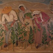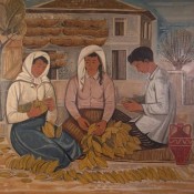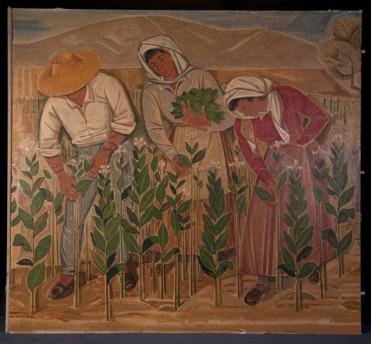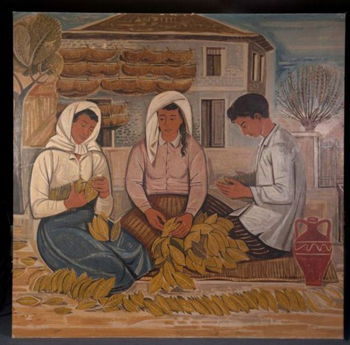 Άνδρες και γυναίκες, που ασχολούνται με την καλλιέργεια και την επεξεργασία του καπνού, σε όλα της τα στάδια και σε πολλαπλά επεισόδια απεικονίζονται σε αυτή τη σύνθεση καταλαμβάνοντας όλη την επιφάνεια του πίνακα. Είναι κυρίως ο μόχθος των εργατών, που αποτυπώνεται στο έργο, με τα δυνατά μαύρα περιγράμματα που χρησιμοποιούνται για την απόδοση των μορφών. Το τοπίο από την άλλη αποδίδεται μόνον υπαινικτικά, ενώ τα χρώματα παραμένουν σε τόνους γήινους και φαιούς με λίγες ώχρες και γαλάζια.