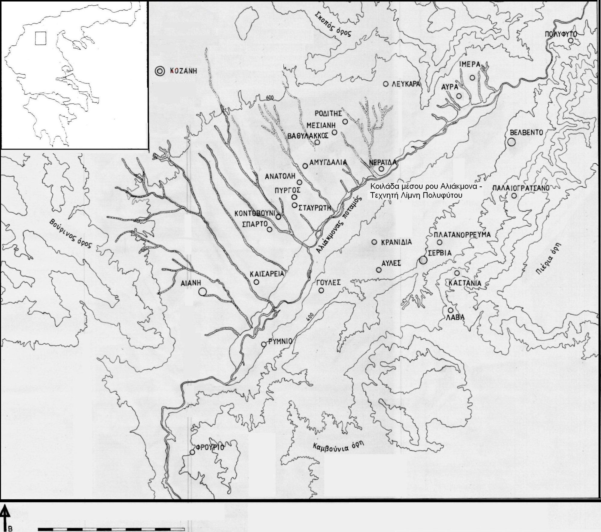 Η επιφανειακή έρευνα στην κοιλάδα του μέσου ρου του Αλιάκμονα άρχισε το 1985 από την αρχαιολόγο Γ. Καραμήτρου-Μεντεσίδη και συνεχίστηκε πιο εντατικά από το 1990, με υπεύθυνη τη γράφουσα (σημ. 9). Μέχρι σήμερα έχει ολοκληρωθεί ο έλεγχος όλης της παρόχθιας περιοχής, σε συνολικό μήκος 60 χλμ. περίπου (εικ. 2). Το πλάτος ποικίλλει από 50-500 μ. (όσο και η περιοχή κατάκλυσης του φράγματος) στο μεγαλύτερο τμήμα της νότιας όχθης, 1500 μ. στη βόρεια όχθη και σε μικρό τμήμα της νότιας, και 5 χλμ. στην περιοχή του Ροδίτη. Από το σύνολο των παραπάνω εργασιών, η συστηματικά ερευνημένη περιοχή κατά μήκος της λίμνης ανέρχεται στα 70 τετρ. χλμ. περίπου. Στην έκταση αυτή θα πρέπει να προστεθούν δύο ακόμα συστηματικά ερευνημένες περιοχές: α) Ο παραποτάμιος χώρος Αιανής, Ρυμνίου και Φρουρίου, στο τμήμα από τη Γέφυρα Ρυμνίου μέχρι τη μικρή κοιλάδα της Μονής Ιλαρίωνα, περιοχή που ελέγχθηκε στο πλαίσιο της κατασκευής του φράγματος Μέσου Αλιάκμονα-Ιλαρίωνα από τη ΔΕΗ, και β) Η περιοχή γύρω από τη Λάβα, συμπεριλαμβανομένου και του αντίστοιχου τμήματος του περάσματος του Σαρανταπόρου, εργασία που έγινε πρόσφατα κατά τη διάρκεια της ανασκαφής στη θέση Κασιάνη (σημ. 10). Επιφανειακά, έχουν ερευνηθεί επίσης, κατά τη διάρκεια αυτοψιών ή υποδείξεων χώρων από αρχαιόφιλους, αρκετά αγροτεμάχια ή άλλες εκτάσεις, διάσπαρτες σε όλη τη λεκάνη Κοζάνης-Σερβίων. Οι εργασίες αυτές, συμπεριλαμβανομένης και της εξαντλητικά ερευνημένης περιοχής της Αιανής, καθιστούν τη γεωλογική λεκάνη Κοζάνης-Σερβίων και ιδιαίτερα την περιοχή της κοιλάδας του μέσου ρου του Αλιάκμονα μία από τις πιο ερευνημένες περιοχές του ελλαδικού χώρου, τουλάχιστον σε επίπεδο εντοπισμού των χώρων.