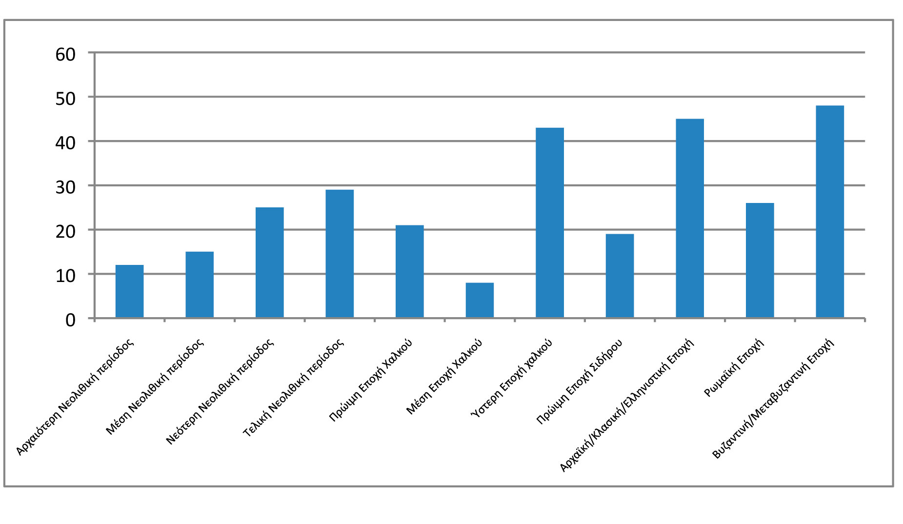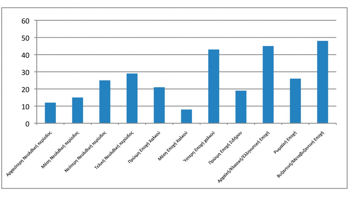 Η κατανομή τους στις μεγάλες περιόδους της ανθρώπινης δραστηριότητας στον ελλαδικό χώρο έχει ως εξής: Στην προϊστορική εποχή (7η-2η π.Χ. χιλιετία) ανήκουν 158 από τις 216 θέσεις και στους ιστορικούς χρόνους (1η π.Χ. χιλιετία έως και την εποχή της Τουρκοκρατίας) 134, από τις οποίες οι 75 εντάσσονται στην Αρχαϊκή, την Κλασική, την Ελληνιστική και τη Ρωμαϊκή εποχή και οι 59 στη Βυζαντινή και Μεταβυζαντινή (σημ. 15) (εικ. 4). Πιο αναλυτικά: