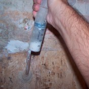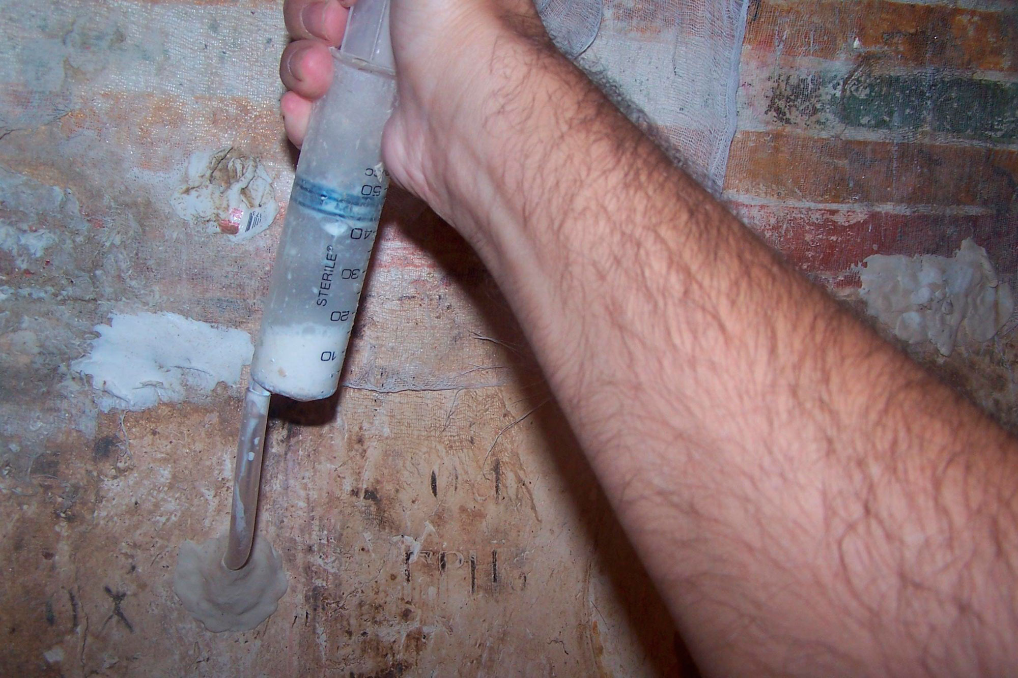 Πριν από την εισαγωγή του ενέματος, είναι απαραίτητο να προηγηθεί εσωτερική διαβροχή με σκοπό να επιτευχθεί καλύτερη συγχώνευση του στερεωτικού με τα υλικά των τοιχογραφιών (εικ. 1). Οργανικοί διαλύτες όπως το (απιονισμένο) νερό, οι αλκοόλες και ο αιθέρας έχουν αξιοποιηθεί γι’ αυτό τον σκοπό.